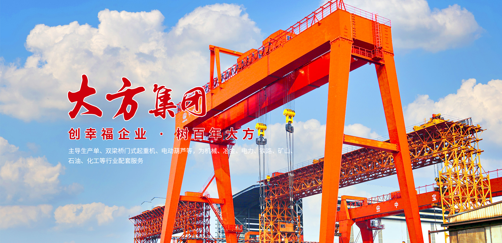 大方集團主導生產單、雙梁橋門式起重機、電動葫蘆等,為機械、冶金、電力、鐵路、礦山、石油、化工等行業配套服務,產品出口至美國、俄羅斯、東南亞等60多個國家和地區